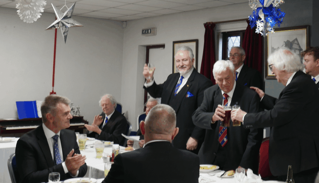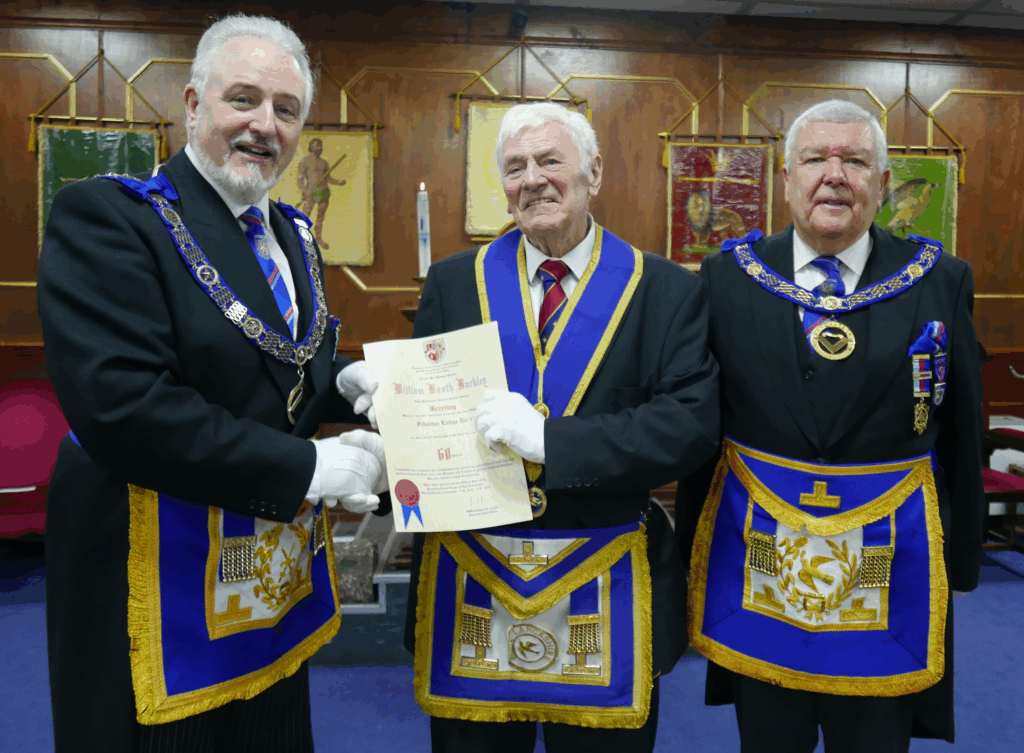 The next item on the agenda was to celebrate the 60 years in the Craft of W.Bro William B Buckley. At this point, the DepPGM called off the meeting and requested that WBro Buckley’s son, who had travelled from France for the occasion, be admitted for the duration of the celebration.