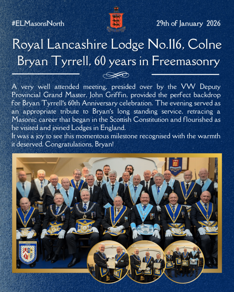 Copyright© 1826 - 2026 The Provincial Grand Lodge of East Lancashire| All Rights Reserved | Designed & Developed by Brother Nick Druce | Proudly hosted by ISSL | Privacy Policy |