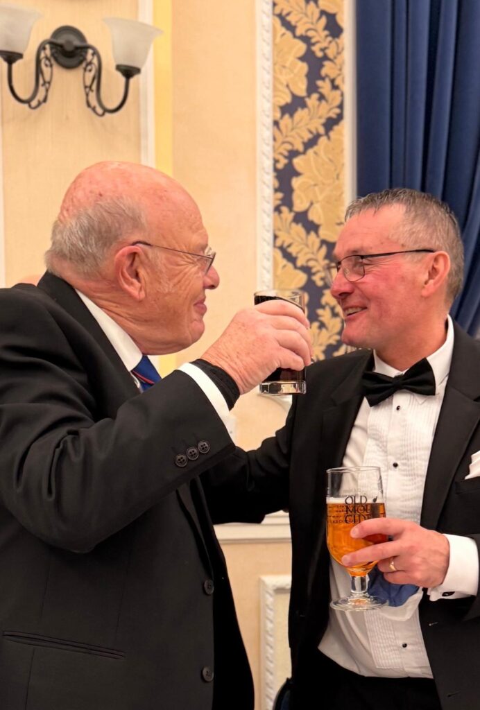 It was a very memorable occasion and carried out impeccably by the lodge Officers. The following Festive Board was enjoyed by all. The picture shows a moment of mutual congratulations between WBro Shrigley and his Immediate Past Master, WBro Lorne Bunn. The group photo shows several members of the Lodge with visitors together with the Worshipful Master.