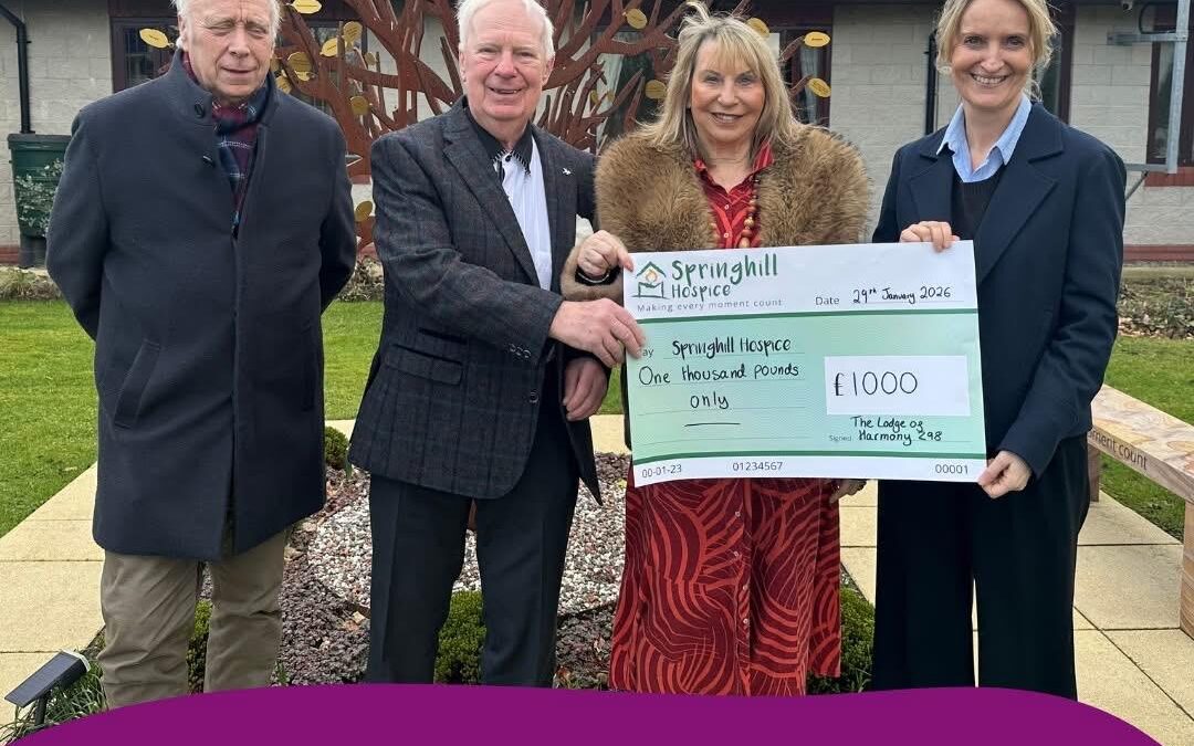 WBro Frank Durns and his lovely wife Joan Durns alongside former Rochdale man of the year 2022 Dave Richardson are pictured here presenting a cheque of £1,000 to Samantha Wells of Springhill Hospice on behalf of Lodge of Harmony 298.
