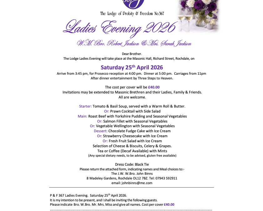 • Lodge of Probity and Freedom – Ladies Evening – 25 April 2026