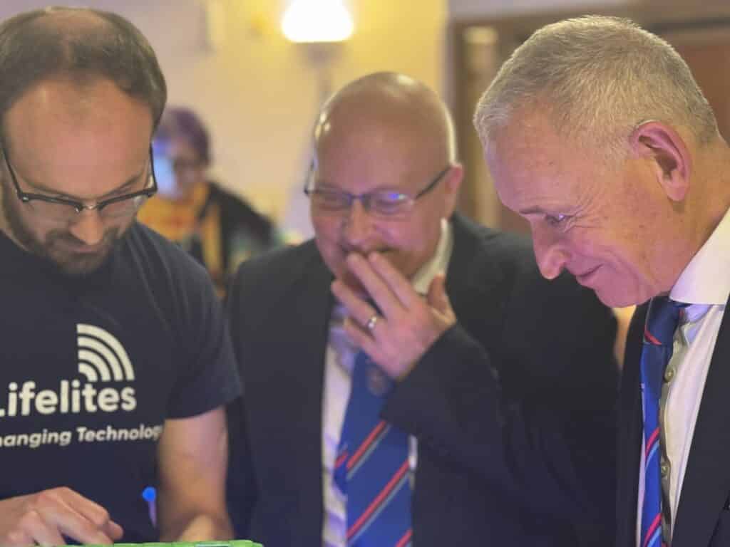 Rob Lightfoot, CEO of Lifelites, demonstrates their inclusive technology to Chad Northcott and the PGM RW Ian Frankl. There was a contest shortly after – Who won?