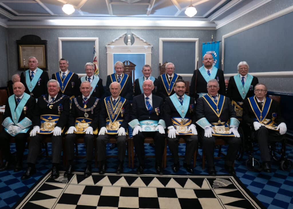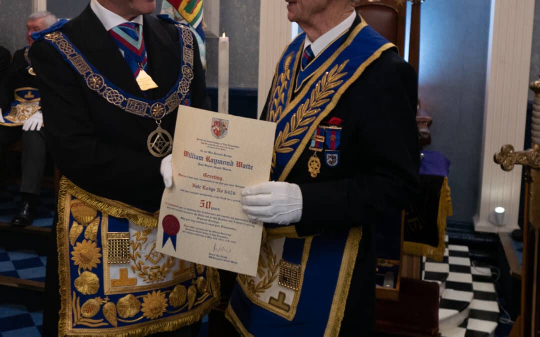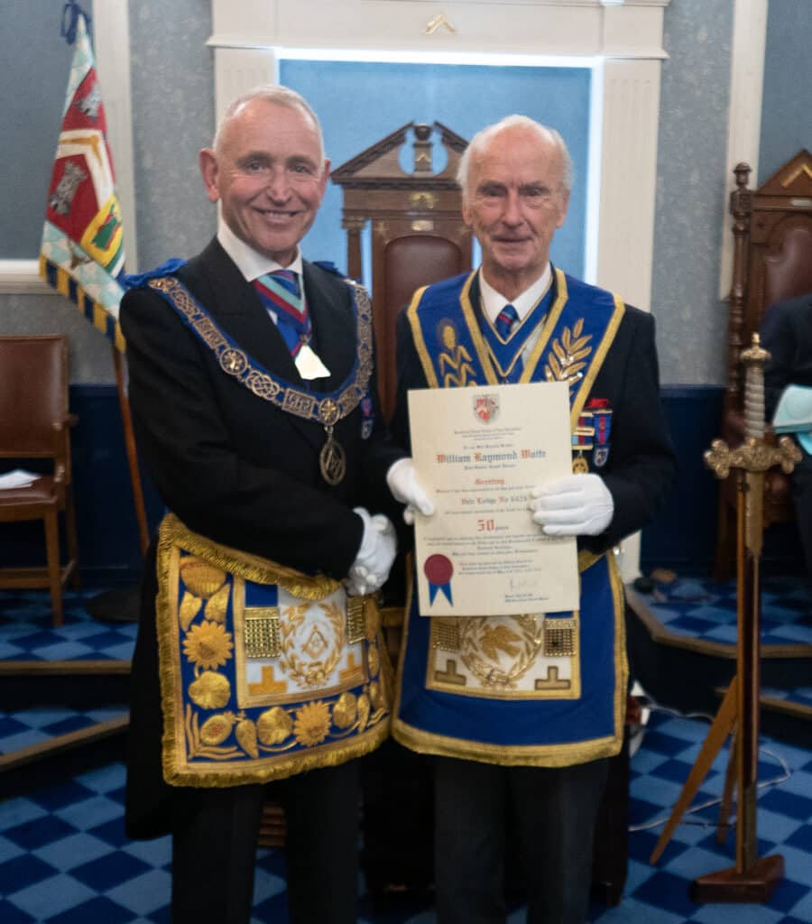 The occasion celebrated the Personal 50 years in the Craft enjoyed by WBro William (Bill) Waite, PSGD, PAProvGM. The Provincial DC, John Lees, placed two chairs in the middle of the Lodge, one for the celebrant and one for the Provincial Grand Master, both of whom had known each other for many years. Aside from personal recollections, their conversation covered WBro William’s long career.